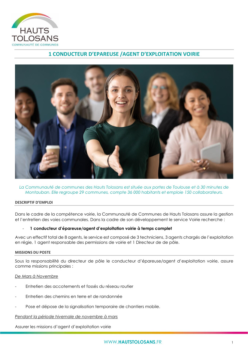 - un conducteur d’épareuse / agent d’exploitation voirie (F/H) à temps complet sur un emploi permanent.