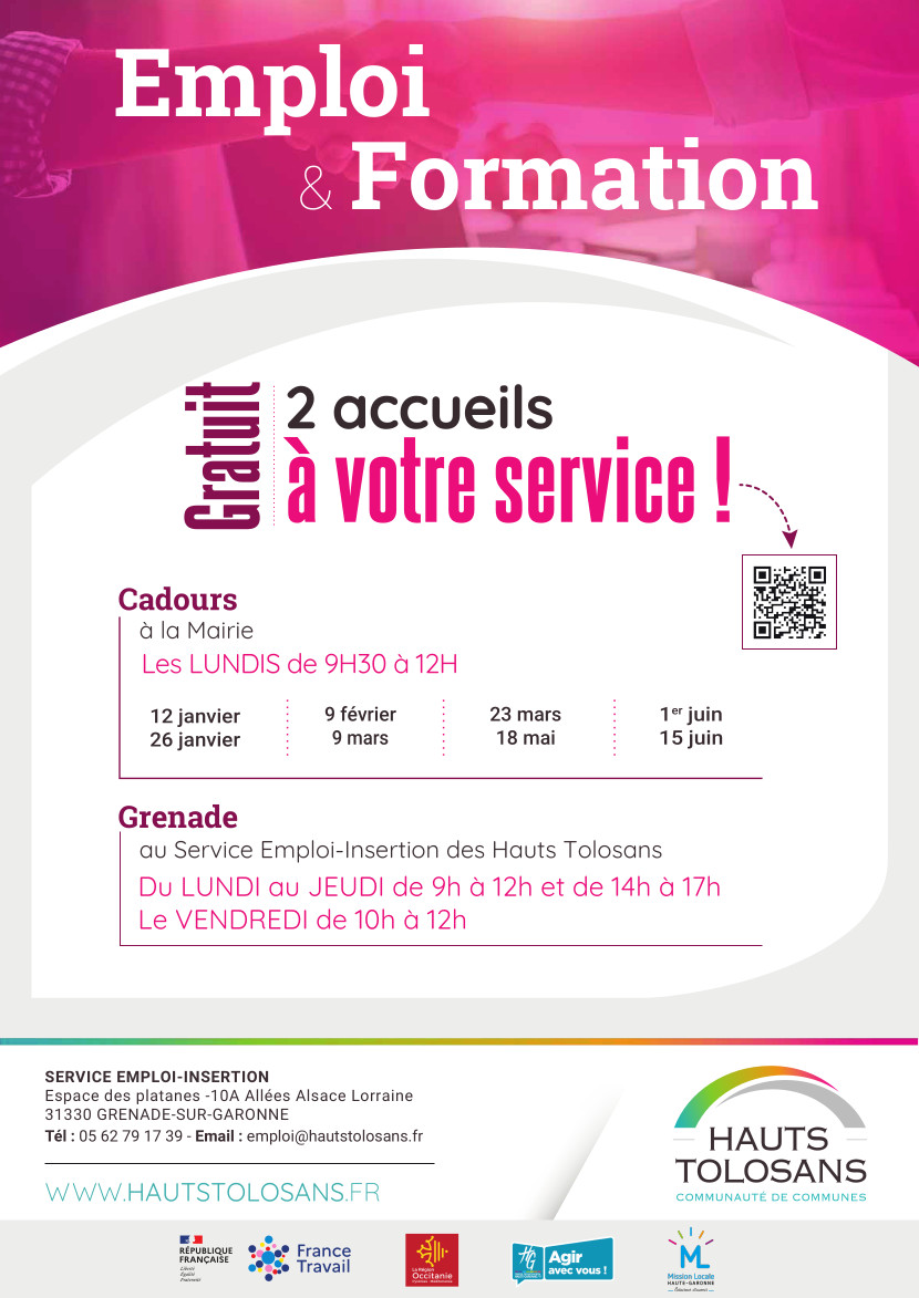 La Communauté de communes des Hauts Tolosans vous accueille chaque semaine à Grenade et Cadours pour vous accompagner dans vos démarches relatives à l’emploi.